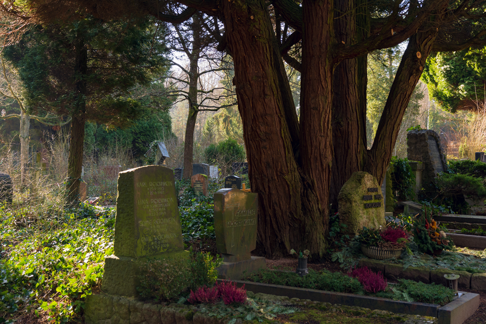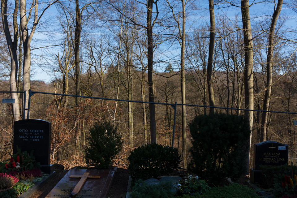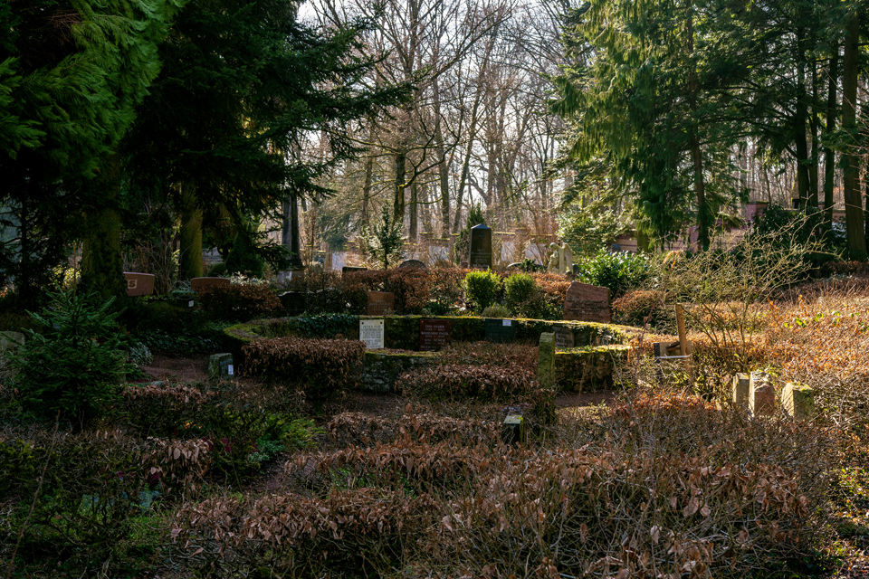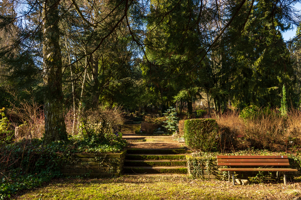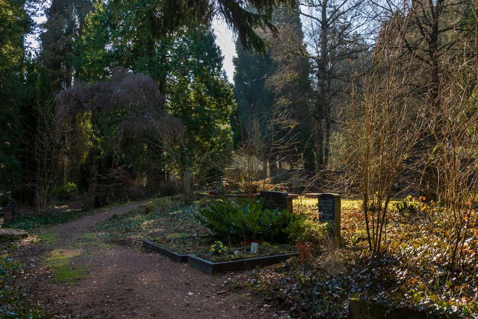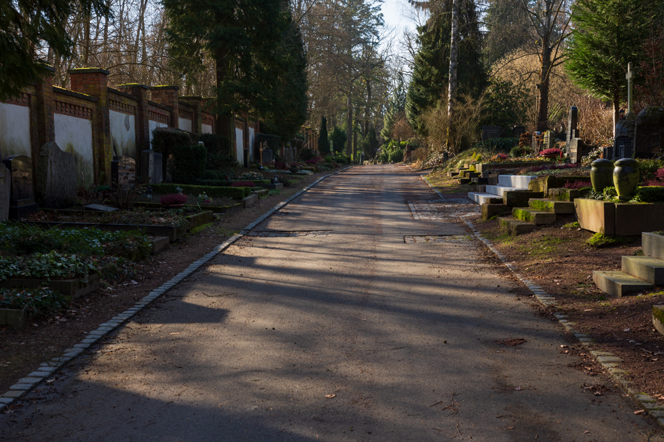 Es war ein frühlingshafter Februar in Wiesbaden. So fand ichden Nordfriedhof in sanftes Sonnenlicht getaucht und wenig winterlich vor. DasHighlight des Monats war wohl die Niederlegung eines Teils der Ostmauer. Siedrohte schon lange zu fallen und war von ihrer Außenseite her länger schon abgestützt worden. So ergeben sich jetzt auf derOstseite des Friedhofs neue Ein- und Ausblicke in den auf dieser Seite bis an den Friedhof heranreichenden Stadtwald. Sehr schön!