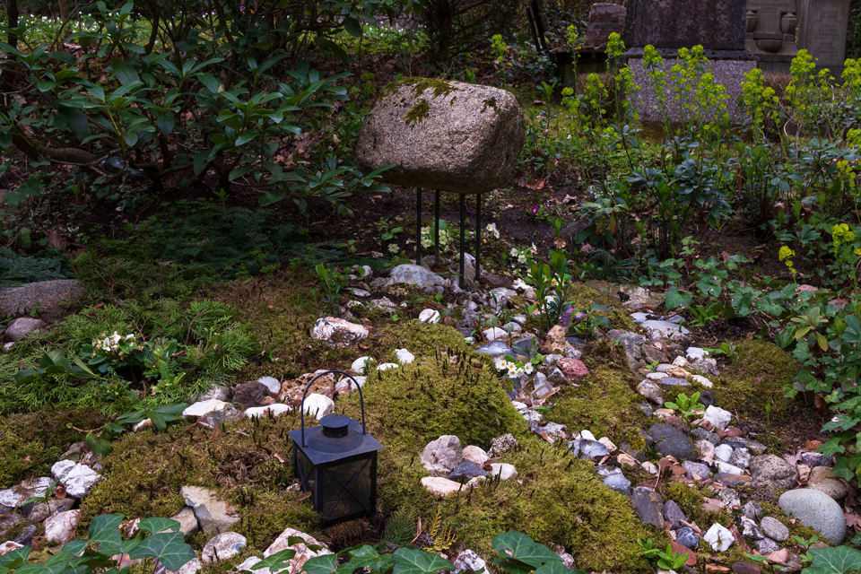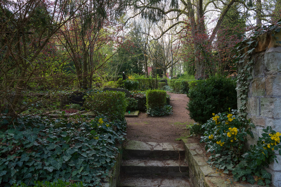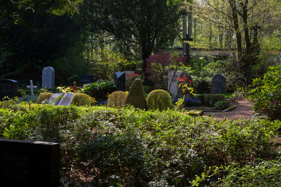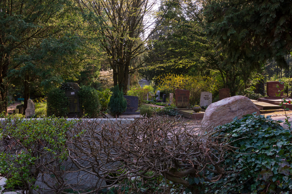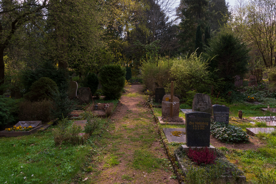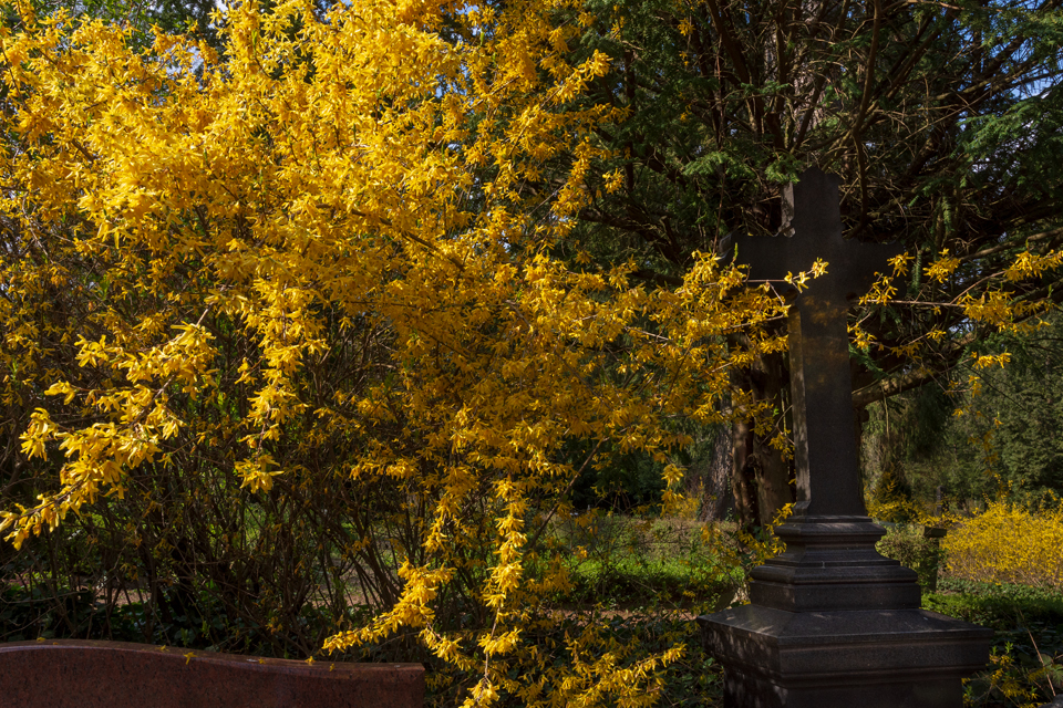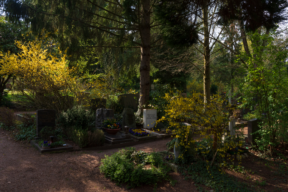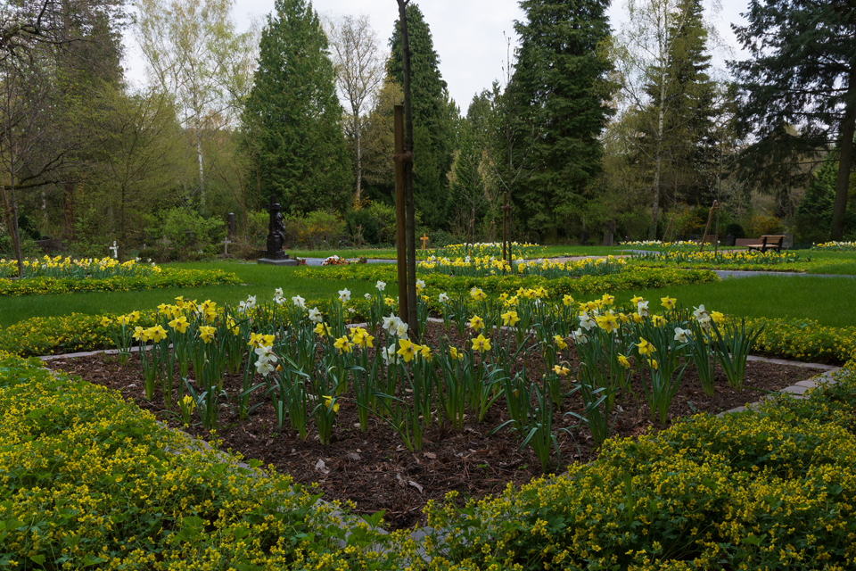 Im April 2019 präsentiert sich der Nordfriedhof frühlingshaft. Der neu angelegte Baumhain für Urnenwahlgräber erscheint im österlichen Glanz.